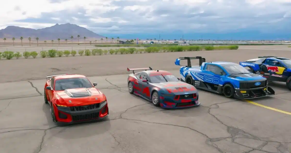 In the video, the new performance car, which is likely to be of the 2026 model year, is alongside other racing cars and a classic Mustang.